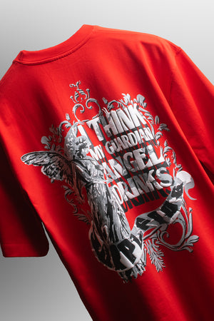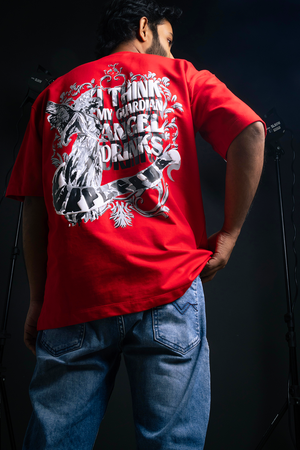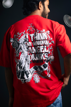 Our new t-shirt design 'I Think My Guardian Angel Drinks' is a playful touch to all those who think mishaps in life happen a little too often with them. Imagine an indulgent guardian angel sitting up there, with a halo around his head, a glass of champagne in his hand and tons of mischief in his eyes. He's not at all an epitome of perfection, but rather someone who is funny, endearing and imperfect. This t-shirt celebrates all of us, who can still laugh through life's mishaps, knowing that our guardian angel is having a bit too much fun up there. Life's a journey with a lot of laughs and a lot more stories of goof ups to share!